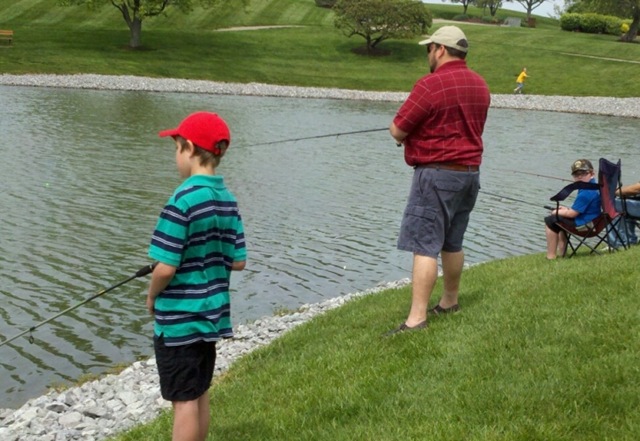 The Puddinpop, Mini-Me, myself and their grandfather took our fishing poles and our tackle-box (which still has lures I don’t understand the use of) to a local apartment pond yesterday with the Pack, and we fished to our little heart’s content.