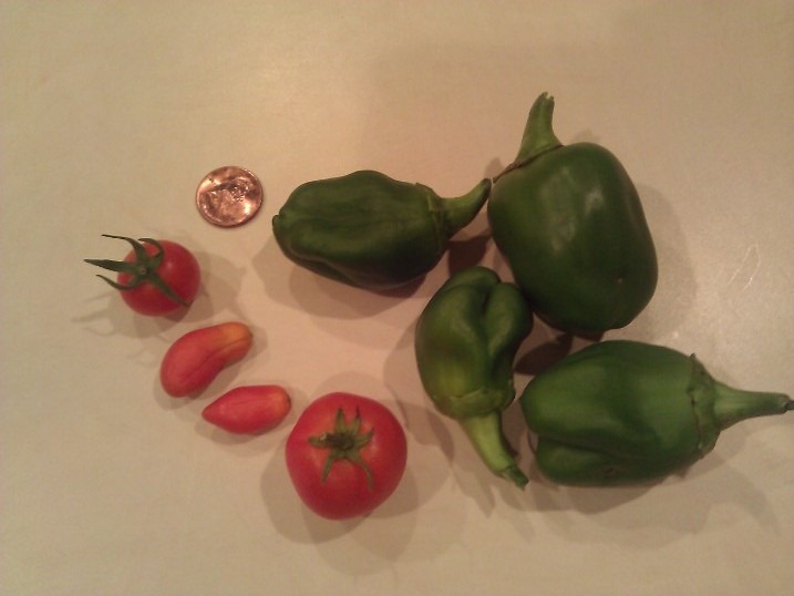 Last night, I harvested what I could from my backyard, um, garden. In the springtime, I’d had grandiose visions of making salsa from peppers and tomatoes grown in my very own dirt, by my very own hands.
