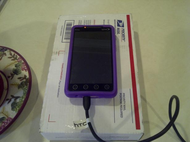 The phone is a shiny, fancy HTC Evo that I procured for the Puddinette. With a purple case, even! She loves purple! I finally got tired of listening to her complain about how crappy, app-short, and un-cool her previous phone was, so I scored this for her just in time for our anniversary on Sunday.