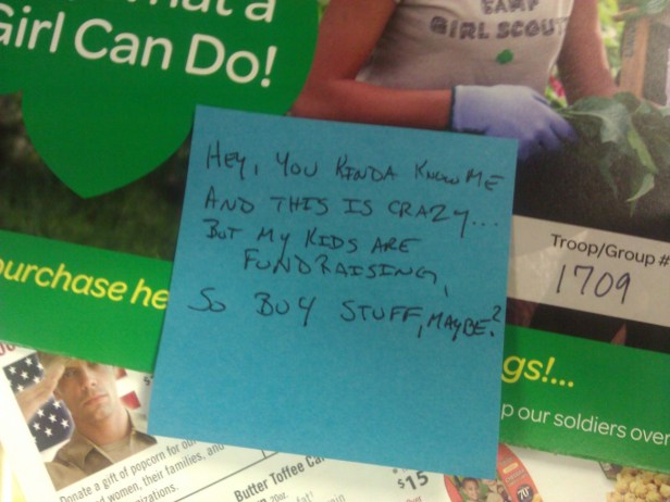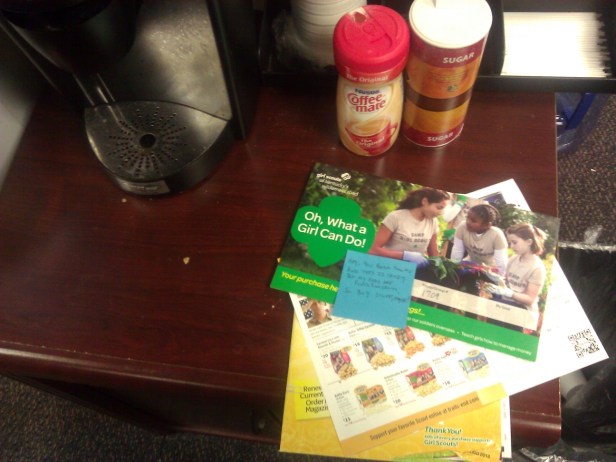 Interestingly enough, that does come with unexpected side effects. For example, the time of year has come when my kids have fundraising responsibilities. So the Puddinette asked if I’d take various and sundry order forma to work in case my coworkers might be easily suckered into parting with their hard-earned cash interested in buying something.