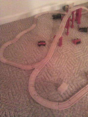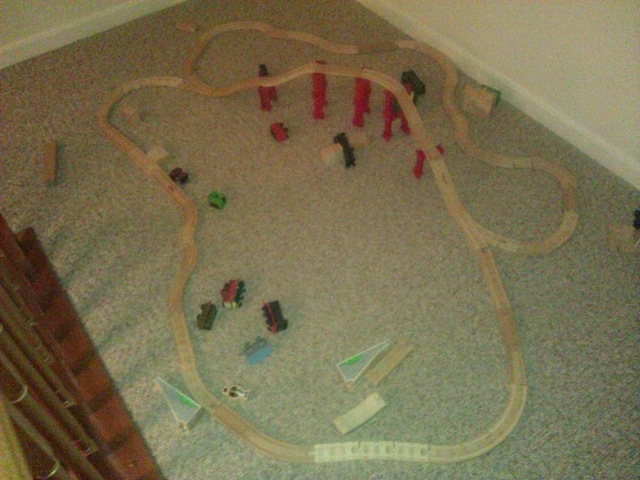 I write often of The Attitude, who turned 4 a scant 14 days ago, and his, well, occasional attitude. Really though, I haven’t really done much justice by him here, because there’s a whole lot more to the kid than just a healthy dose of obstinacy. For one thing, the boy often shows more enthusiasm than Richard Simmons conjures up the moment he slips into those shiny lamay shorts. For another, at just barely 4 years of age, my youngest son is capable of engineering and construction feats that would confound most adults. For instance, his train track arrangements would likely befuddle both parents, both sets of grandparents, and quite possibly more than a few city engineers. His latest creation, which he informed me today was a “huuuuuuuuuge track”, is pictured below.