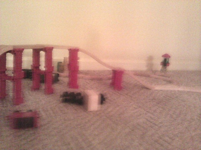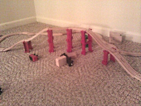 Oh, and just for reference, this is not the most complicated track he’s ever made. A few days ago he somehow built one with an elevated split that bridged to another track and later dismantled it in favor of a double decker bridge. I’m wondering if I should offer his services to the planners for the Brent Spence Bridge project.