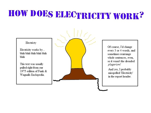 Pretty awesome, right?  The mediocrity didn’t end there, though.  Oh no, that was just the beginning.  I’d then proceed to “write a report” about the prescribed topic, which generally meant I’d copy two pages worth of material about electricity from the family set of Funk and Wagnalls encyclopedias**, changing it here and there to put it “in my own words”.  Those two pages of hand-written “report” (which I have little doubt could only have been legible to the kind of master of handwriting analysis you see on forensics shows claiming that, obviously, John the always quiet neighbor had homicidal tendencies based on the the aggressive loop to his ‘S’s)  would then get stapled to said poster stock (and usually not aligned vertically).  Personally, that would have been enough for me.  But somewhere along the way I’d learned that you need Visual Flair to really wow!, um, whoever it was that cared about these punitive, childhood-ruining science fair sentences, so I’d then freehand some kind of poorly drawn image between the report pages. You know, a light bulb, or something contextually appropriate.