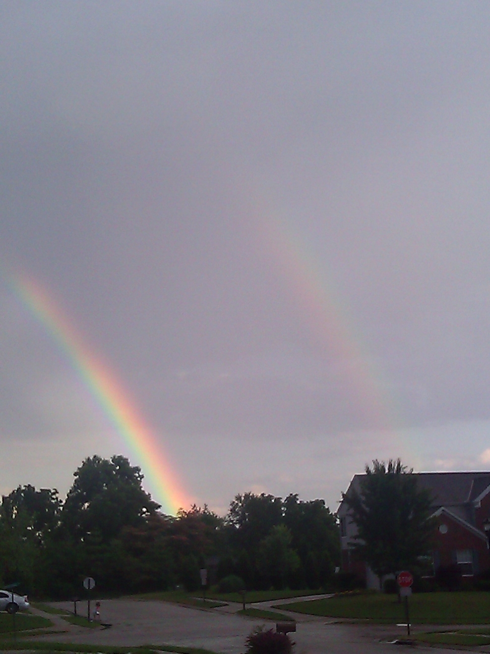 What’s that? Clouds not your thing? Fine, here, have a double rainbow. I caught this at the end of the street when we got home from the Puddinpop’s baseball practice. Ah, what does it mean, indeed?