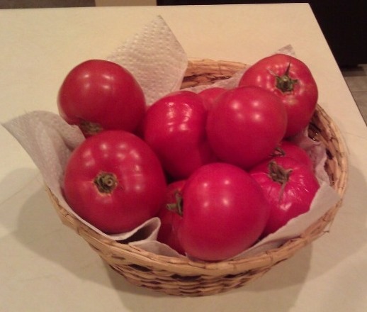 My father-in-law gave us quite the gift last week, as his tomato plants apparently went from “Ehhhh…maybe we’ll produce something for you eventually, if you ask really nice and wait until we’re damned good and ready” to “EFF YAY BABY! LET’S TURN UP THE ‘MATER PRODUCTION AROUND HERE TO 11!”