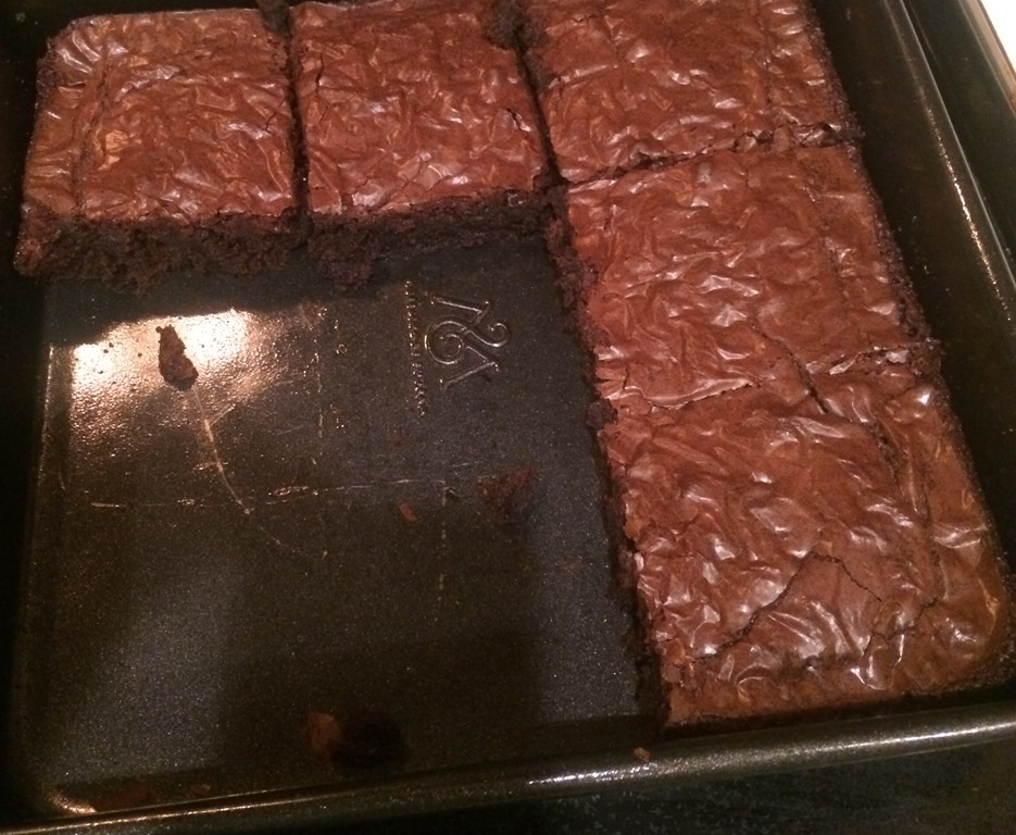 What’s that gooey pan of deliciousness, you ask? I’ll tell you, my friend, it’s brownies. A big pan of yummy, just-baked-and-waiting-for-someone-likely-named-Puddin-to-come-embarrass-himself-in-gluttonous-joy, brownies.