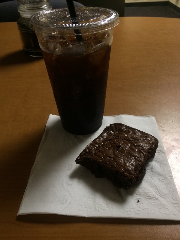 Yes, that’s an enormous iced coffee that I assure you was as dark and bitter as the soul of every aspiring author along side a delicious brownie. Brownies, as it turns out, make fantastic breakfast food. Mmmm…soft and chewing and chocolatey and full of hope and joy and wonder.