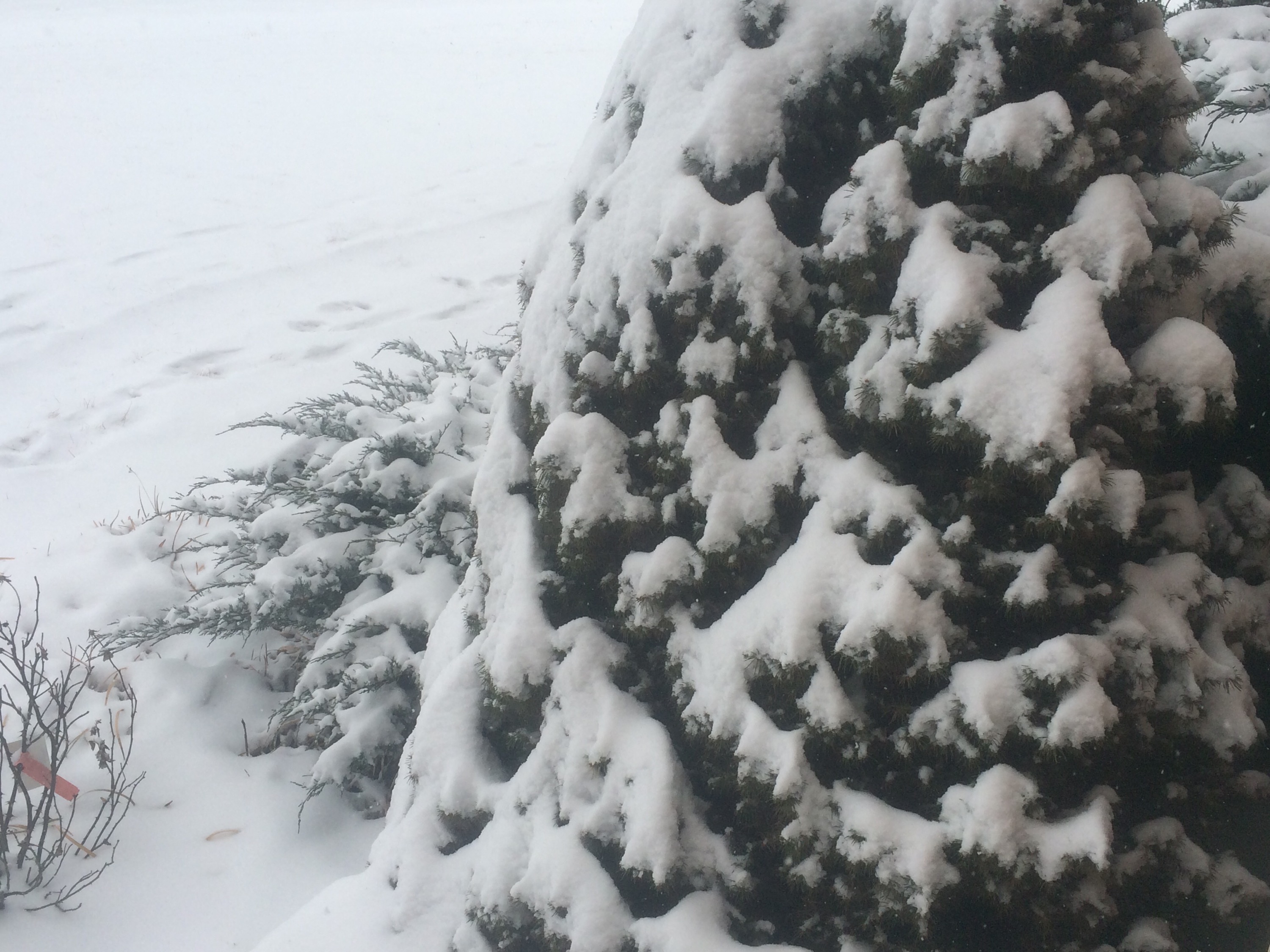 Clearly, then, I had to take a picture of the fluffy white stuff in the front yard. Well, or half of it anyway. A bunch more fell after I snapped that picture.