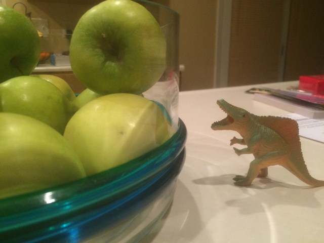 Last night, I found a lonely dinosaur in the kitchen long after all the kids had gone to sleep. The accompanying tale that popped into my brain demanded I get a picture so I could give you this installment of Unintended Domestic Toy Theater, a classic tale of hunger, misguided ambition, and disproportionately large fruit.