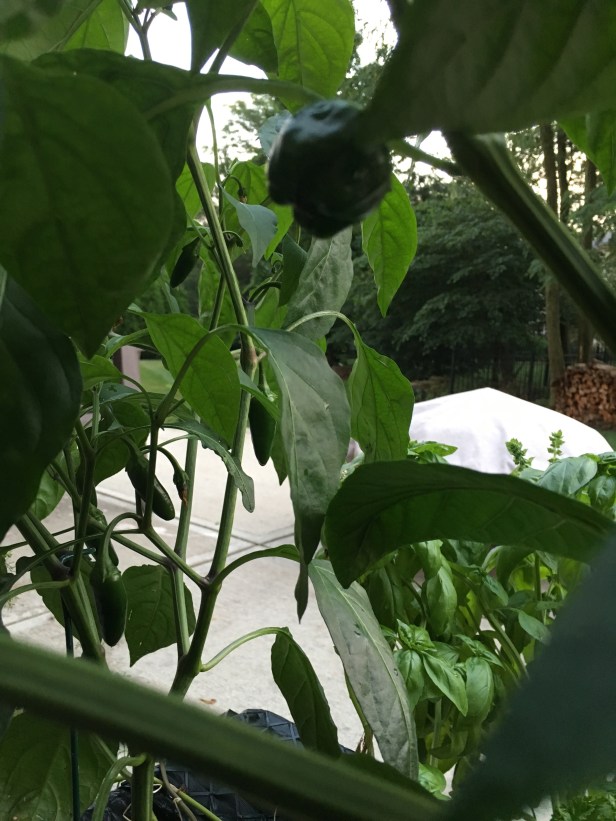 For those interested, there are actually two plants there, a bell pepper plant and a jalapeño. If you look at top, in the foreground, you’ll see evidence of the former. In the background are a few dangling examples of the latter. All of which means, if I play my cards right, in a month or so maybe I’ll have me some salsa fixings.*