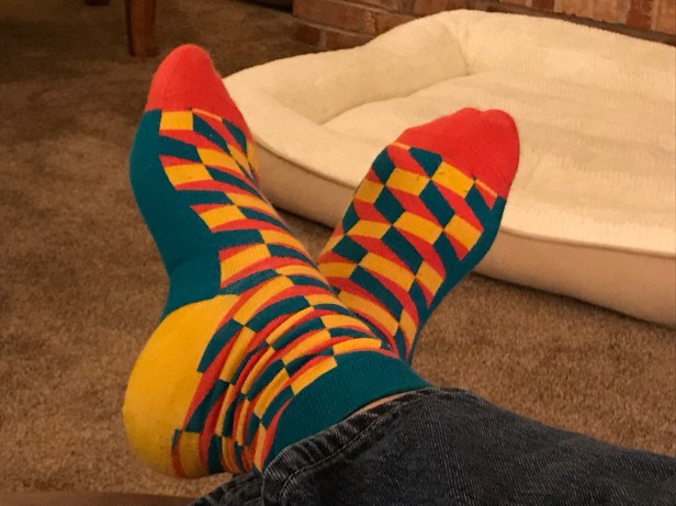 As promised, today’s socks certainly bring on Da Funk. I have to admit, this might even be my favorite pair so far. Not only do the colors involved come close to not matching each other, the pattern is highly reminiscent of QBert, a game I gave thousands of quarters to in my youth.