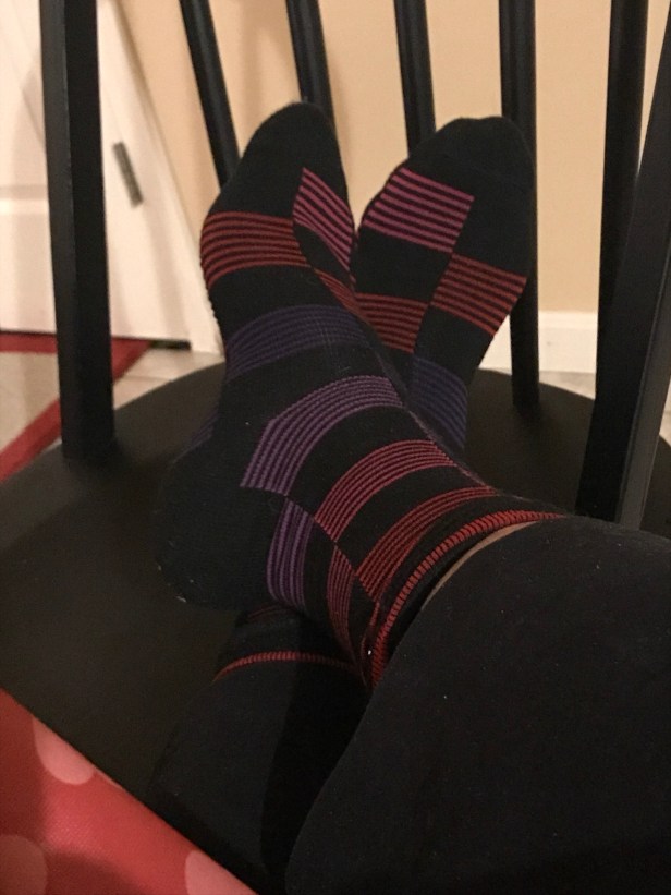 I was scheduled to have An Important Meeting today, so I gussied myself up suitably (by which I mean I put on the old Busimess Casual instead of denim, even going so far as to double check to make sure my shirt buttons went mostly straight down the center of my chest. I also pulled out my favoritest new fancy socks, rocking a sweet striped pattern with some kicking color — sensible, but still colorful enough to ask where the after-party is going to be.
