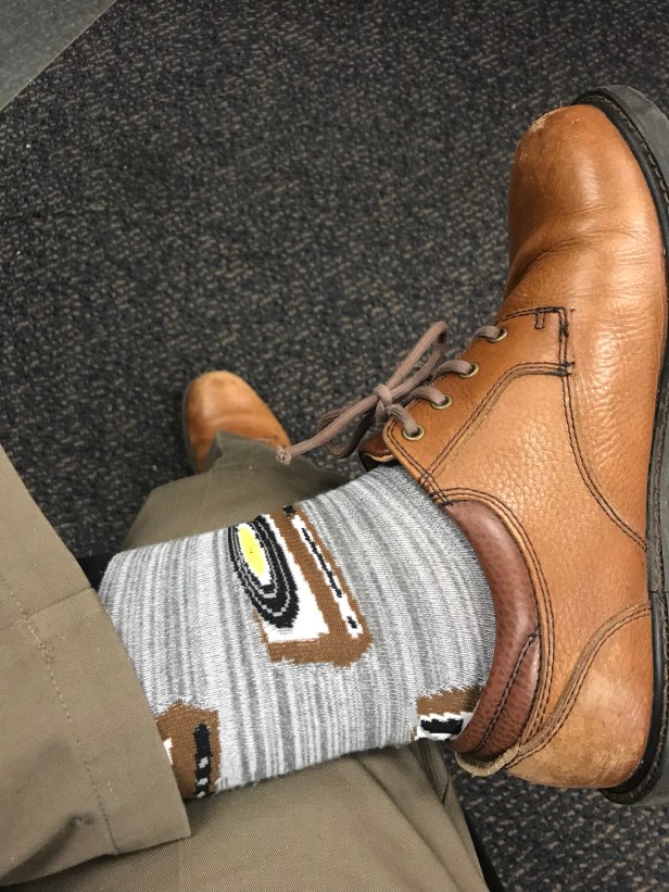 Finally made it in for those big meetings today, but by Thursday, there’s been too much week for socks that say, “at least sort of professional”. No, Thursday needs some chill, maybe even some cool tunes. Luckily, these record player socks fit the bill just right.