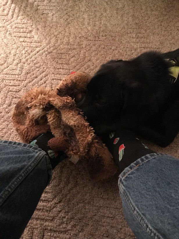 Smoky, our 8 month-old Black Lab mix bringing his “Friend”, his favorite stuffed teddy, who likely doesn’t feel overly keen about this whole friendship since real friends aren’t suppose to chew on each other and pulled all their stuffing out until nothing but a sad fabric shell remains.