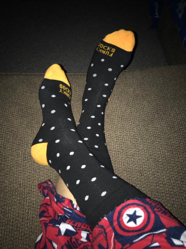 Anyway, that’s why tonight’s socks picture was taken in the dark, against my Captain America night pants. Because I was out for a bit earlier, and the shot I tried before I got home just didn’t work, so this is me, at Monday’s end, about ready for bed, asking you to like today’s black-and-white polka dots with orange accents.