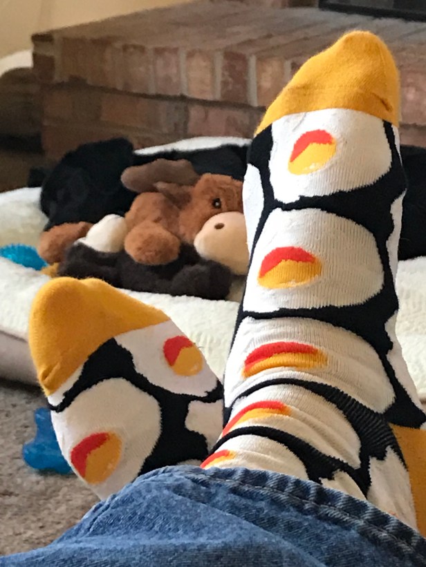 I’m not sure who’s having the best Sunday afternoon here — me in my brunchy egg fried socks, or Smoky, crushing hard on a mid-Sunday afternoon nap atop a pile of his favorite stuffed friends. Either way, everyone photo’d here is thoroughly enjoying a little leisure afternoon time, the benefits or which can simply not be overstated.