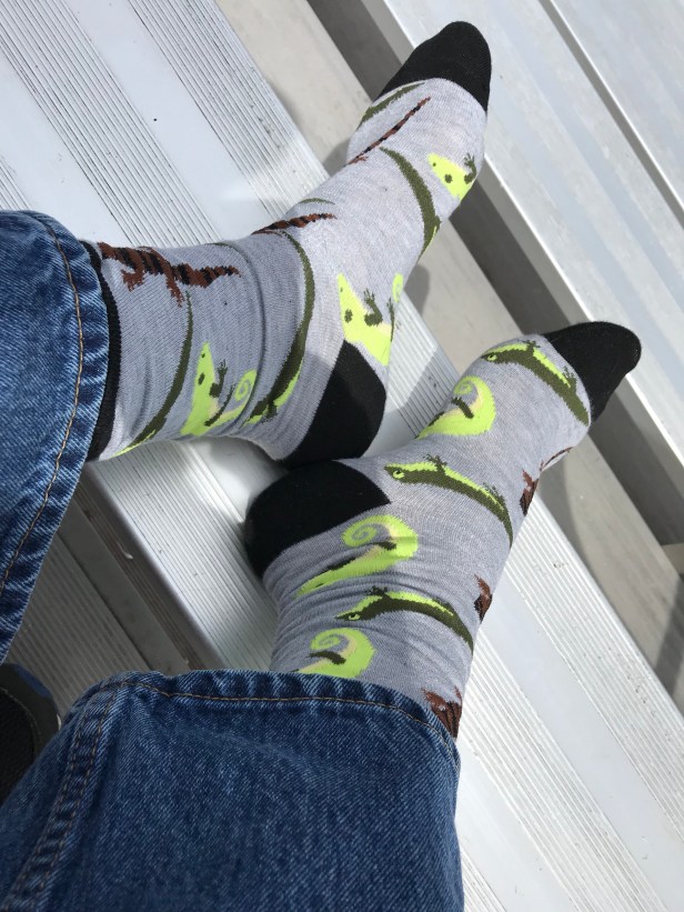 I got a chance to get out and bask in the sun for a bit today during my son’s lacrosse game. Accordingly, I figured it’d be a good time to let the lizards on today’s socks bask on the bleachers a little bit themselves. We all enjoyed a dose of vitamin D and my son even scored his first goal. Hard to complain about any of that.