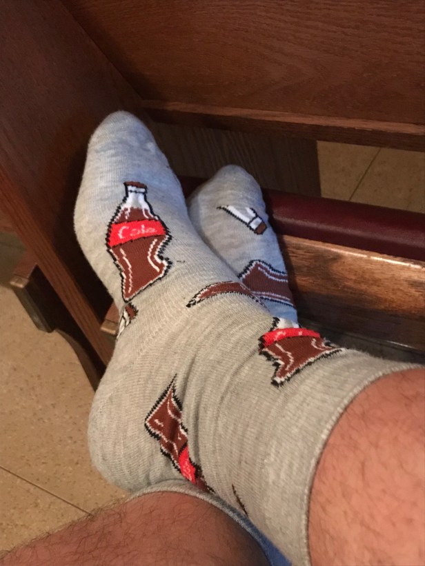 Which made today’s sock choice pretty simple. Sure, the “unidentified” cola knitted into these crews hasn’t contained the controlled substance able to give anyone an actual chemical pick-me-up for, like, a century (thank goodness), but knowing I had those perky curved bottles on my feet this morning definitely helped…at least a little bit.