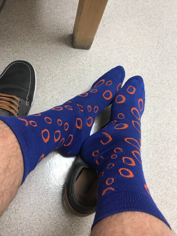 It probably isn’t obvious that these socks are special. I mean, to be honest, I’ve referred to these as the Spaghetti-O socks since the Puddinette brought them home. Because to me, just like any kid of Generation X, orange rings the rough color of cheese/tomato sauce just sing Franco-American. But these socks, unlike the 182 pairs that came before them, actually have been the only ones to become the dreaded Mateless Pair before they even got to the Drawer of Plenty.