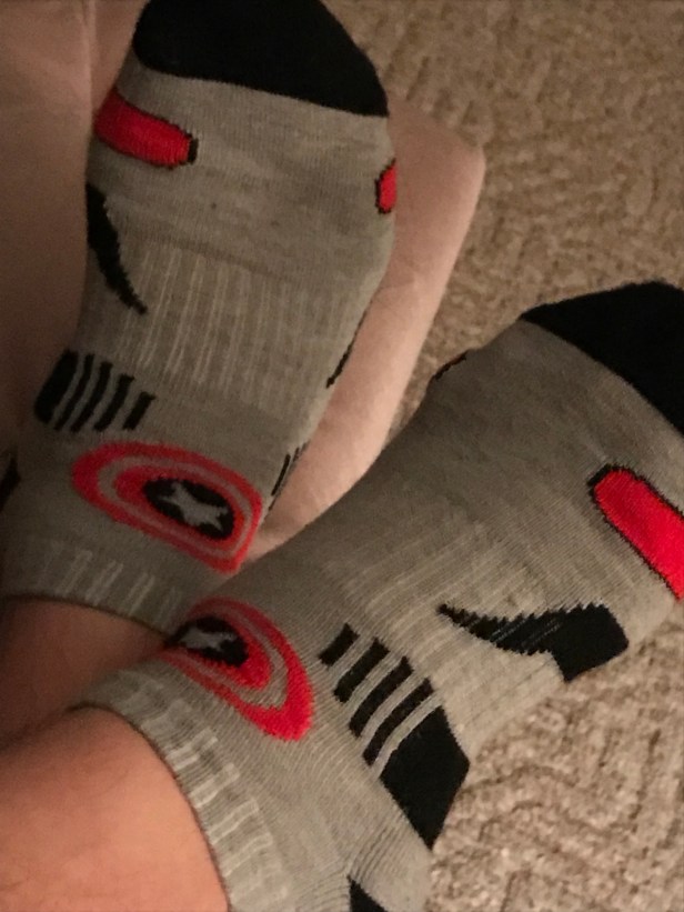 Cripes! I almost forgot to post today’s socks. Here they are, a variation of Captain America in all their Comic-Con-homagic (is that a word? Screw it, it’s 2 AM… everything’s a word at this point) glory.