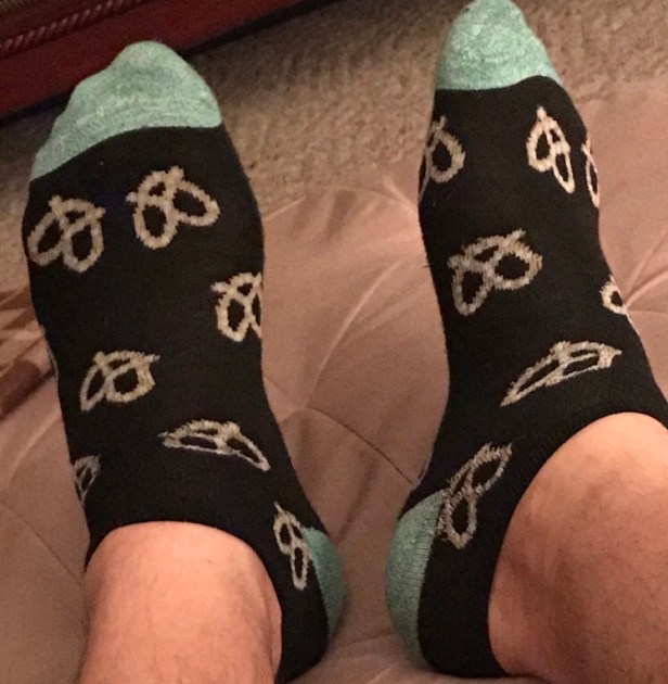 Today’s pretzel socks continue the Food Week theme in an ankle-length format that basically screams “Weekend”.