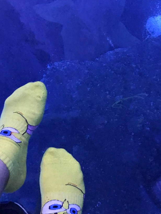 We thus gave Mike his farewell today, and in doing so, I snuck as many shots of my SpongeBob socks at the aquarium as possible. The best, I think is the one posted above with a group of drowsy penguins, but this one on a glass plate looking down onto one of the aquarium’s famous shark rays is pretty good too.