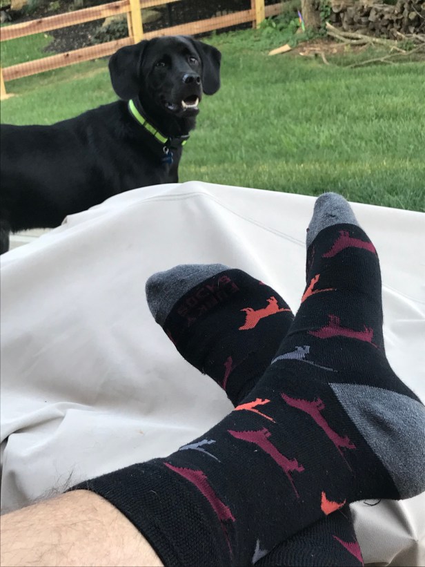 Seen here about to issue a vurry serius vocal rebuke to a pair of nefarious-looking sidewalk-goers, I was glad to be able to get a shot of Smoky I’m frame with my Belated National Dog Day Socks, which I, believe it or not, did not pick out this morning with any relevant intentions.