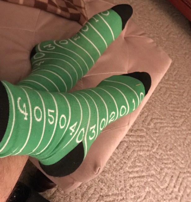 Are you getting sick of football-related socks yet? I figured probably so, but that I might as well wear these today, since it’s the first Monday night of a brand new season of Monday Night Football. Truth be told, I wanted to wear them to kick off Sports Week, which may or may not end up being an actual, entire week, but is likely to be entertaining either way.