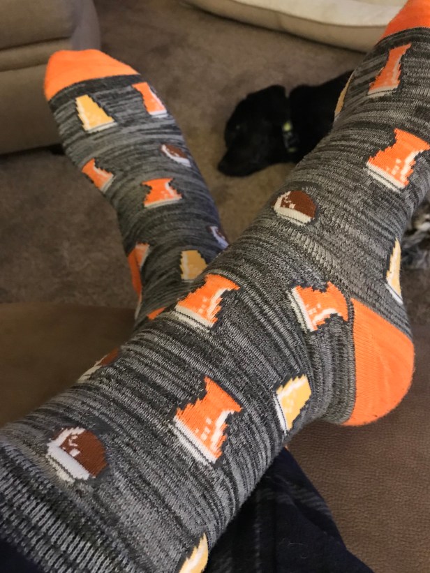 Secondly, and more importantly, I realized just how many of my early posts included Smoky in the picture. My puppy always wants to play, and is rarely without some withered piece of cloth that was formerly a stuffed animal but has been completely liberated of both squeaker and all stuffing. As a result of his enthusiasm, there are a lot of pictures throughout this year that include both socks and Smoky. And I couldn’t be happier that he joined me so many times for the evening sock picture.