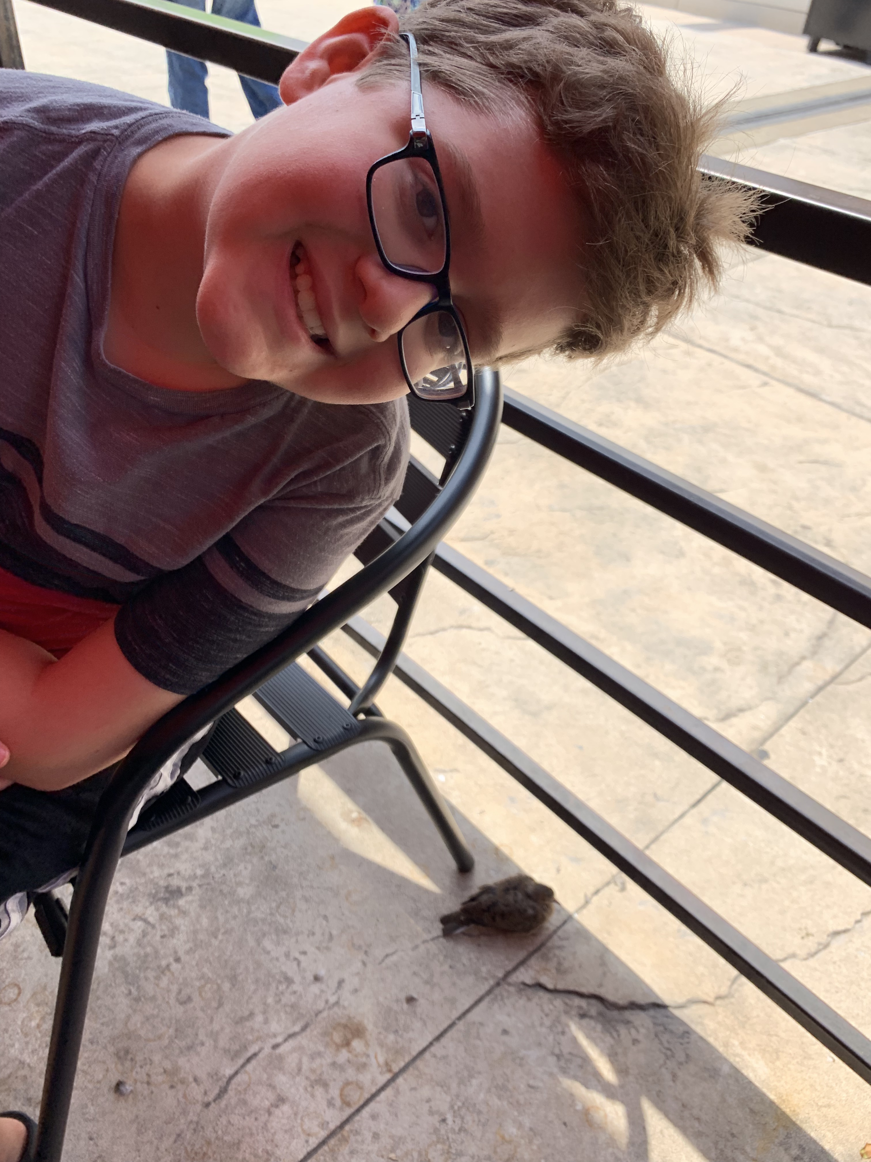 For now, here’s a picture of lunch on Day 7, and the birdling that literally flew down, landed on Youngest Son, and perched on him moments before I got this shot.
