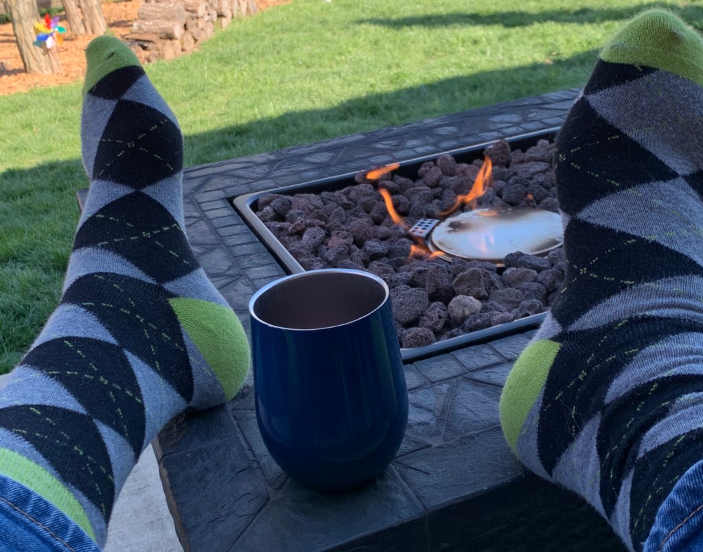 Thankfully, there are always a few upsides, if you know where to look. For instance, at 5:30 PM this evening, when I closed the laptop for the day, Happy Hour was no further than 20 feet away, out on the patio with the wife, a nice cozy fire, and the wine of her choosing. Plus, as an added bonus, it’s always pretty sweet when Happy Hour gives you the chance to show off today’s color-splashed argyle.